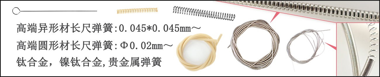 白金,黄金,铂铱合金,钨钢,镀金钨钢等对应如上难加工材质对应线径几十微米线材对应圆形线材,扁线线材对应旋绕比大于22(外径特别大),小于4(外径特别小)的特殊弹簧