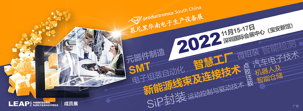 慕尼黑华南电子生产设备展(productronica South China)依托于德国母展productronica立足深圳,针对华南地区日益增长的电子制造技术及设备更新的需求,集中从表面贴装技术、电子和化工材料、点胶与粘合技术、电子组装自动化、测试测量与质量控制、电子制造服务,到线束加工与连接器制造、半导体及元器件制造、先进封装技术、运动控制与驱动技术、工业传感器、机器人及智能仓储等,为产业链呈现电子行业智能制造针对热门应用行业的创新解决方案。